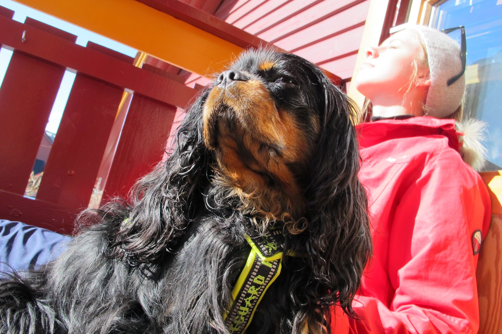 Jeg tok ikke noe bilde av dem - for man skal ikke forstyrre privatlivets fred. Istedet ble det arkivbilder i dag - av Dattera som satt på trappa og koste seg i vårsola med hunden sin, i påsken i fjor.